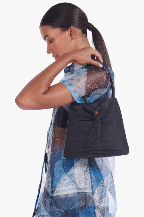 onze nieuwste felix-tas is gemaakt van hetzelfde duurzame nylonweefsel als onze confectiekleding. deze schoudertas heeft een ritssluiting en een trekkoord met schildpaddetail langs de body van de tas.