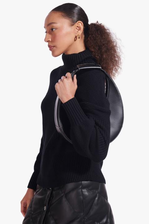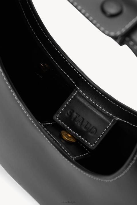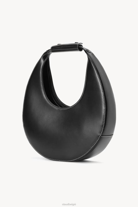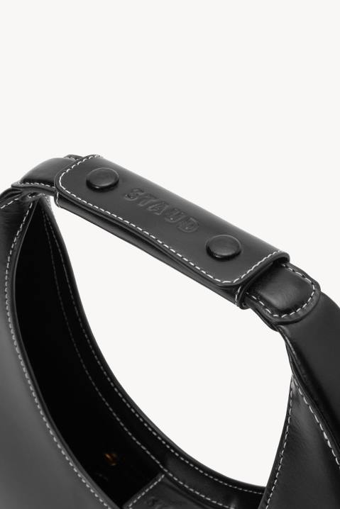 de maantas heeft een gebogen handvat met een verwijderbaar staud-reliëfaccent. ontworpen in de vorm van een maansikkel met suède voering aan de binnenkant en een magnetische sluiting om je benodigdheden vast te houden.