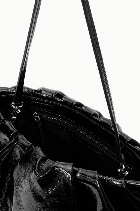 een clutch van zacht lakleer, de phoebe-tas kan worden omgezet in een schouder- of crossbody-stijl. deze stijl heeft twee afneembare bandjes in leer en ketting.
