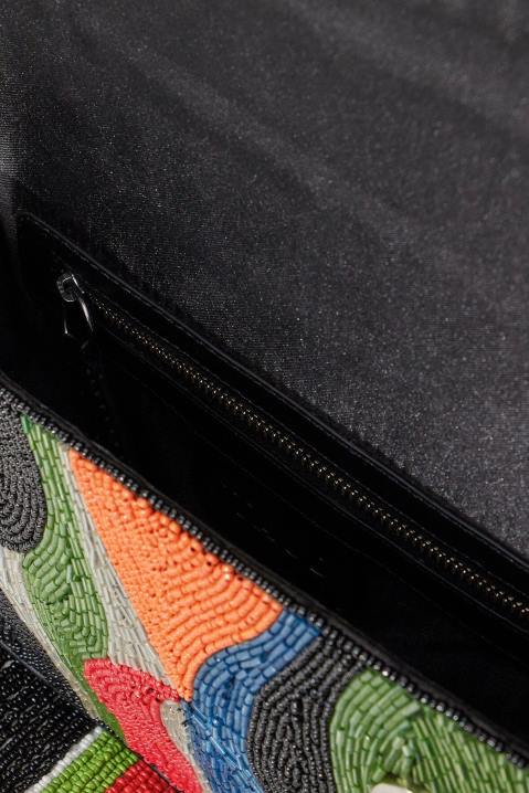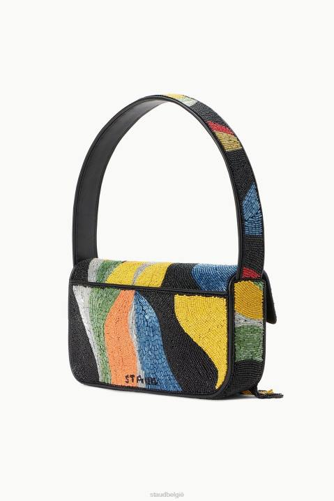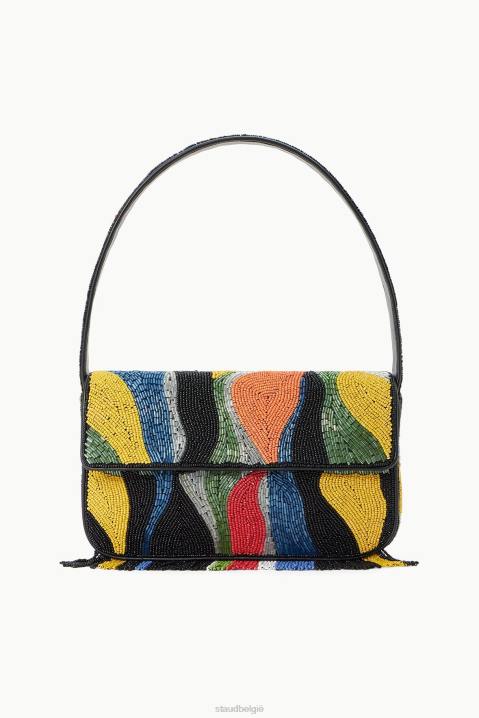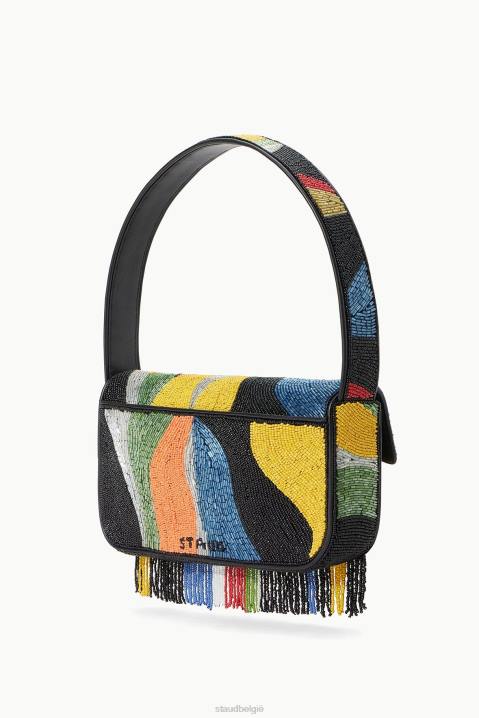 de klassieke handgerolde schoudertas met vegan leren biezen en franje aan de onderkant. deze tommy-update heeft een kleurrijk abstract patroon en een magnetische drukknoopsluiting.