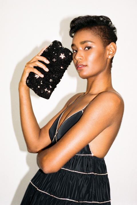 een handgerolde update van onze kenmerkende tas. de beaded bean is de perfecte avondtas, in een strass-sterrenbeeldpatroon. deze stijl heeft een maansikkel van strass op de achterkant.