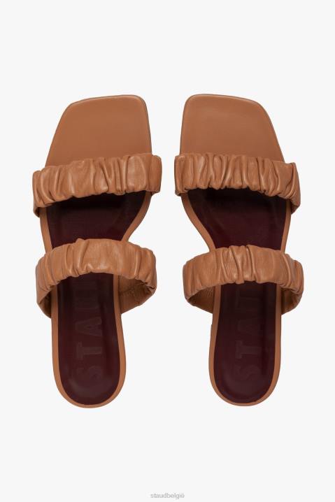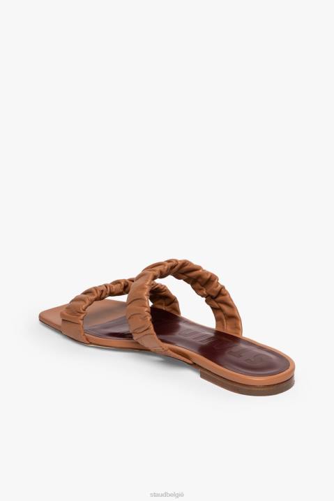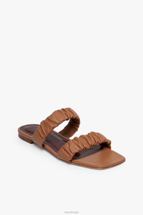 de maya is een platte leren sandaal. deze sandaal heeft twee bandjes met ruches en een kleine hak voor extra ondersteuning.