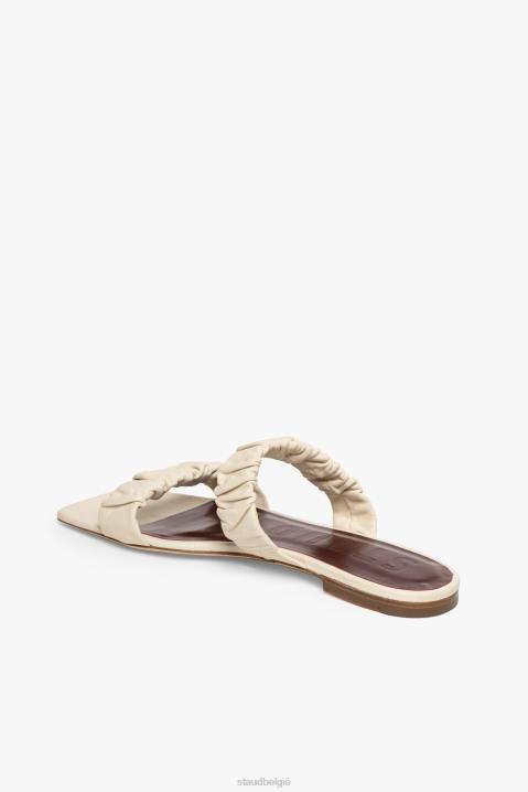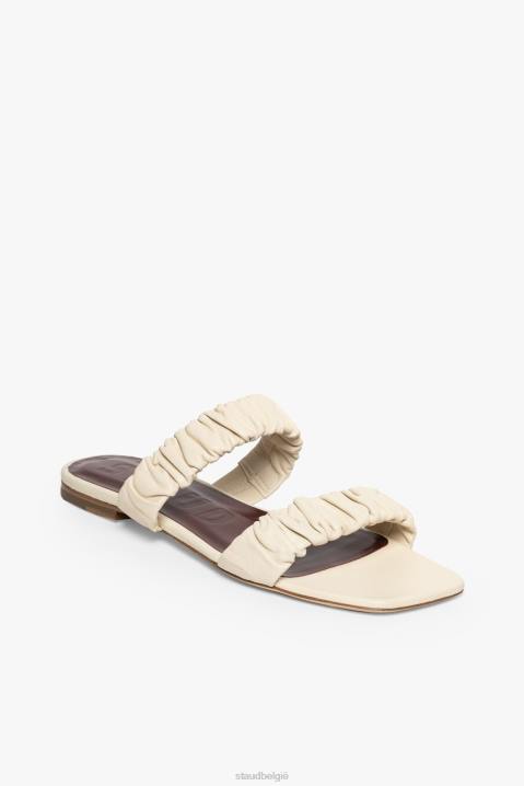 de maya is een platte leren sandaal. deze sandaal heeft twee bandjes met ruches en een kleine hak voor extra ondersteuning.