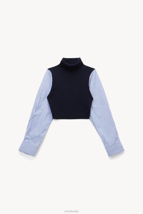 een coltrui van merinowol met contrasterende gestreepte popeline overhemdmouwen. de louisa-top completeert een bijpassende set in combinatie met de miley-rok.