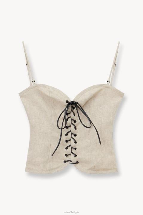 de emery top is een korset met spaghettibandjes aan de voorkant, een sweetheart halslijn en smokwerk aan de achterkant.