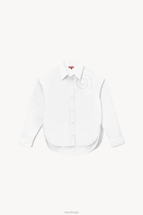 een oversized poplin-knop omhoog, de emersyn-top heeft een statement swirl-borduurwerk op de borst.