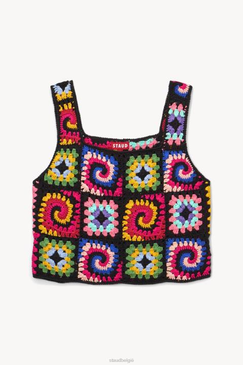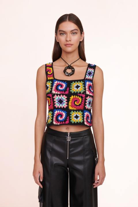 een geheel gehaakte tanktop, de psychedelische top heeft gekoppelde oma-vierkanten met wervelpatroon.