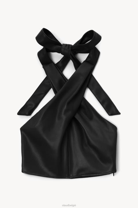 de kai-top is een cropped, aansluitende haltertop gemaakt van een licht rekbare vegan leren stof. deze stijl heeft een zelfbindende hals en een verborgen ritssluiting aan de zijkant.